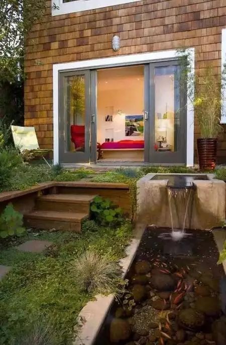 后院,家人最喜歡的活動空間,僅僅綠植和木平臺顯然不夠。加一條疊水小溪流,池子里鋪滿鵝卵石,看著凸起的野草,聽著嘩啦啦的水流響起,宛如走進山水田園。