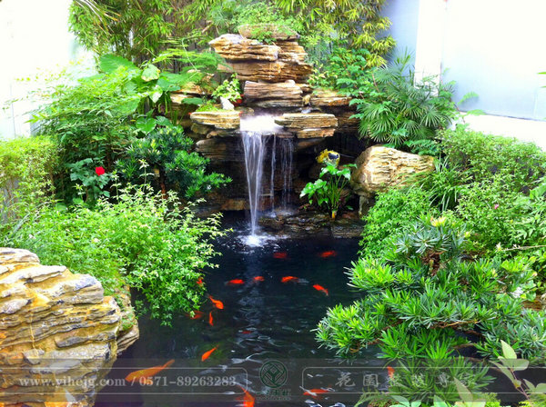 小空間,大水池,水里金魚嬉戲,岸上植物茂盛,陶罐上的流水更是畫龍點睛的奇妙。