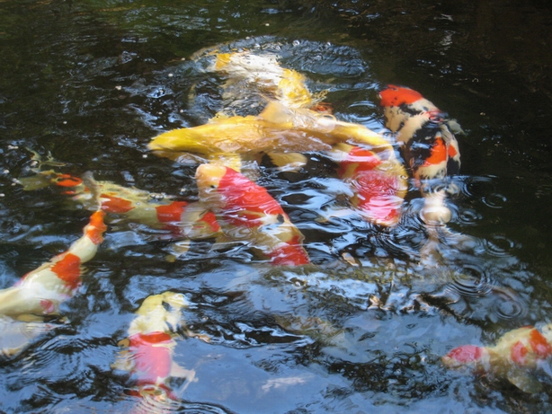 假山疊石,浮萍、水草、金魚渾然一體。